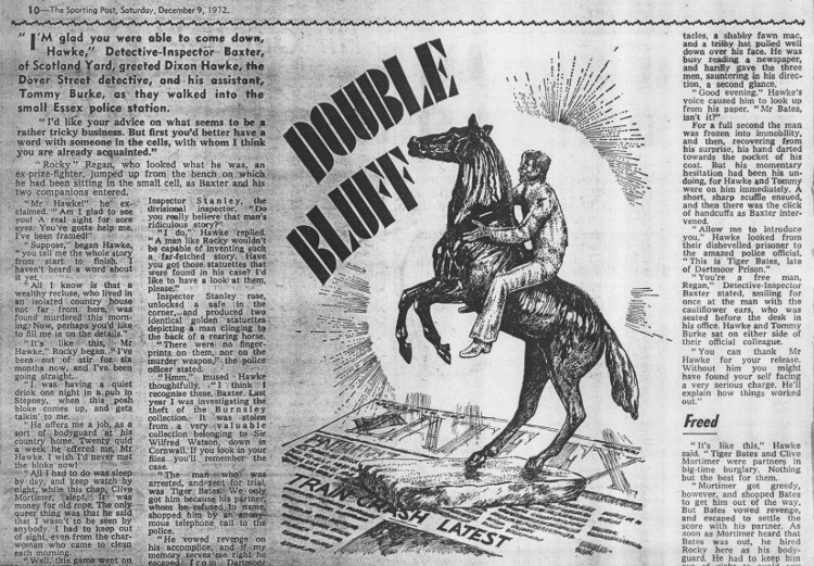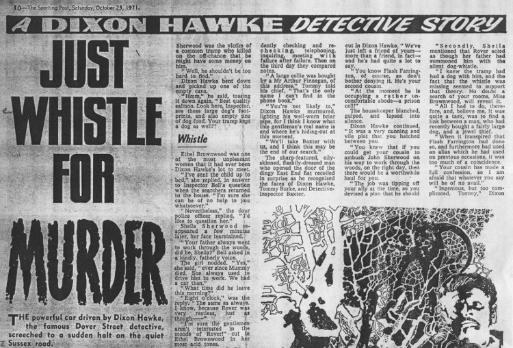 IntroductionDixon Hawke was a detective, assisted by Tommy Burke, whose adventures were published in Dundee by D. C. Thomson, the folk behind other titles as diverse but long running as The Beano, The People's Friend and The Scots Magazine. His first appearance was in The Great Hotel Mystery, published in The Saturday Post on 6th April, 1912, but he soon found his own publication, the Dixon Hawke Library, which ran from 1919 to 1941, as well as featuring in a boys' paper called Adventure, starting in 1921. Annual Dixon Hawke Case Books followed and eventually he found his way back to The Sporting Post, a weekly sports paper (The Saturday Post had become The Sporting Post in 1914), if indeed he ever left. Having appeared in over 5,500 stories between 1912 and 2000, Hawke may well be the most published literary character, even ahead of his influences. As Guy points out in an article on his Dixon Hawke Stories (guynsmith.com), Dixon ('the famous Dover Street detective') and Tommy were "really carbon copies of Sherlock Holmes and Doctor Watson, as were Sexton Blake and Tinker." Of course, Guy had already created his own carbon copy in Raymond Odell, but he was glad to take on Dixon Hawke too and his first submission was accepted. Over afternoon tea in Birmingham, the editorial director asked him to write more, which he duly did. Of course, Dixon Hawke stories were written by many authors, none of whom were ever credited, and their titles were often changed without notice. Guy also discovered that D. C. Thomson didn't want to rely too heavily on one writer, so rejected some submissions for no apparent reason. It's therefore difficult to confirm which of the many Dixon Hawke stories were written by Guy, especially as they didn't always send tear-sheets, or copies of the pages on which the stories featured. Certainly his stories were written between April 1971 and June 1978, while some contained an element of horror. He returned to Dixon Hawke in 1996. The stories listed here are the only ones positively identified; the listed original titles highlight how often they were renamed. It's possible that some of the undated stories may have been retitled to stories listed with dates. For other work, return to Short Stories or Broken Backlist. List